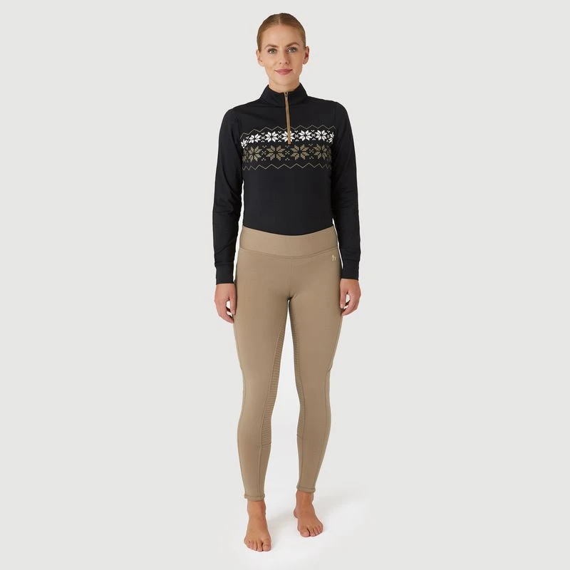 The soft, breathable fabric with brushed fleece lining is ideal for holding warmth in to keep you feeling cozy even on cold weather rides. The mid-rise waist is perfect for layering and the simple front closure wont feel binding in the barn or in the saddle. For added security, the silicone full seat adds a little extra grip to keep you secure in the saddle on those days when your horse is feeling a little frisky.