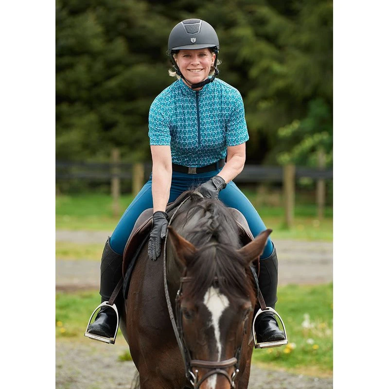 Fun, equine-inspired prints dance across this super breathable top, camouflaging and hiding dirt as flattering contrast side panels slenderize riders silhouette.