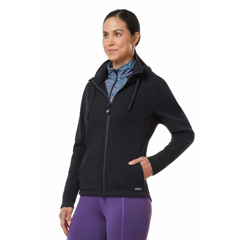 Full zip styling with luscious, plush fleece inside and a soft, matte exterior that sheds hay and dirt. Stretch panels free you to reach for forelocks and carve a flattering, feminine silhouette. Pop the hood on this tech top for post-ride warmth, but even hood down, the extra tall collar keeps you cozy. Two front hand-warmer pockets, plus a bonus inner pocket to keep your phone handy.