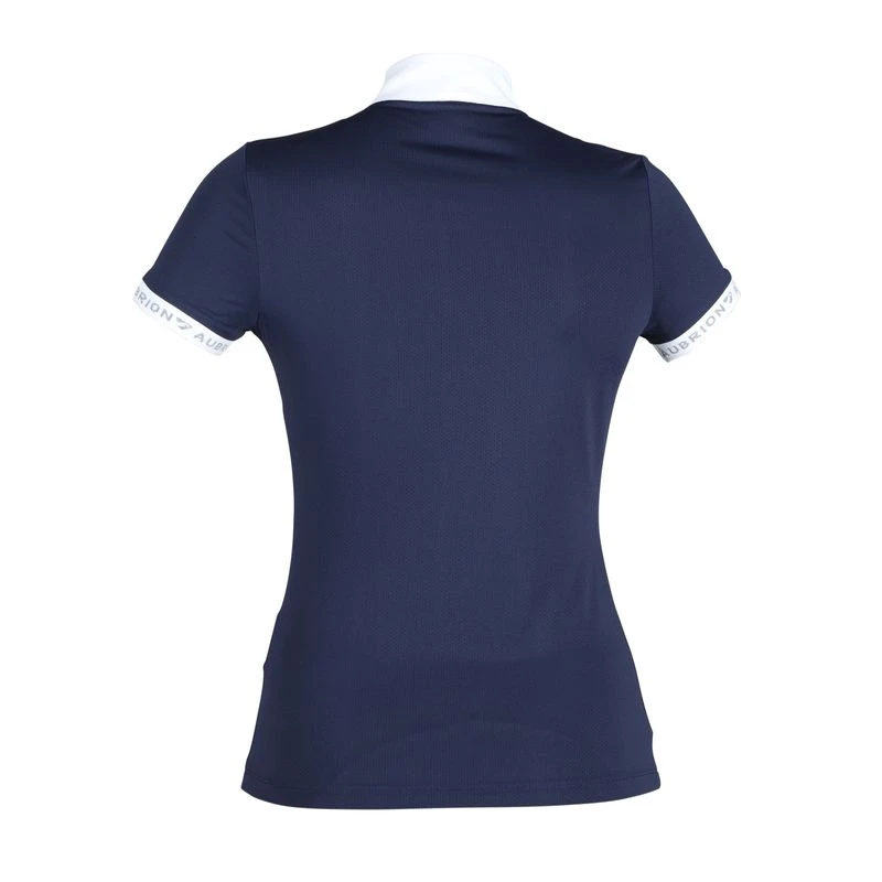 This stretch show shirt features a button tab front closure with tab collar. It is short sleeved, ideal for hot summer show days. The lightweight stretch fabric is form fitting, so it is smooth under your show coat. Colors have contrast white, or opt for the solid white version.